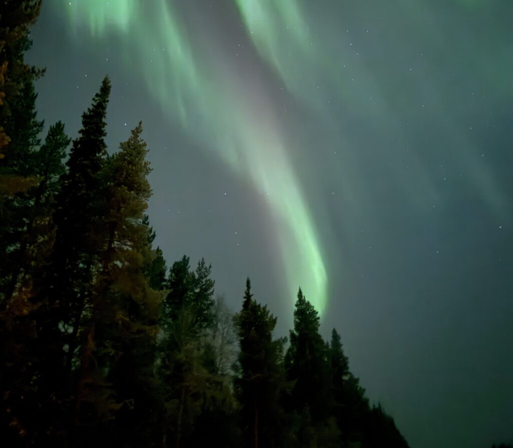 We followed some reindeer tracks, noting where they’d disturbed the snow in search of shoots and lichen, entered a small clearing, and expectantly stared up at the sky. The geomagnetic readings on Leevi’s aurora watch app were strong; however, the Northern Lights were nowhere to be seen. We passed the time spotting constellations: the plough, Orion’s belt, North Star, Jupiter…in fact the whole of the Milky Way twinkled like diamonds. It was at this point that we noticed a few white shadows moving slowly across the sky. Whipping out our phone cameras (it was so cold, you could only manage two minutes before hand and phone went numb) we realised the whole sky was awash with green and purple, the white wisps displaying bright green through our lens. There was so much solar activity, this was the reason for the bright sky on a no-moon night.