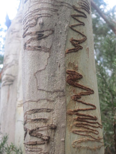 We visited the Blue Mountains just before we left Sydney and were suitably wowed by the vast acres of forest stretching out below Katoomba’s Echo Point. As we ambled down a path there between eucalyptus trees, I noticed the bark. It looks as if someone’s scribbled on it or done some crazy modern machine stitching embroidery. This particular tree was very near the sandstone cliff on the other side of the path, where tourists over the years have graffitied their names. (Judyth has just informed me they’re called scribbly gum trees and the scribbles are caused by the larvae of a moth.) Two sorts of writing on the landscape, one organic and one static.