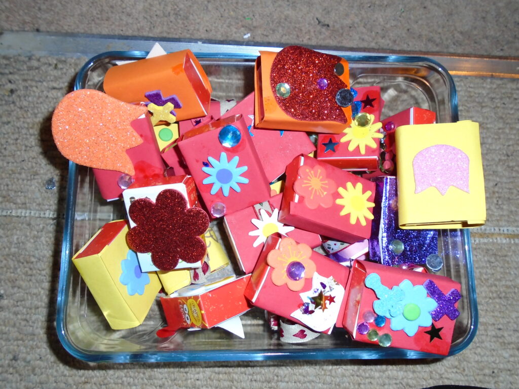 The photos show: packs of raisins decorated at Leominster Messy Church for refugee children and given out in the Calais and Dunkirk camps; spice bagging at Leominster Messy Church on the day of the European referendum (our theme was worry and we were bagging up spices to take to Calais—thinking about the worries that refugees have and ways we can help them); me packing the milk we bought with donations of money from Herefordshire into boxes of food in Calais; and boxes of food for ten people ready to be distributed on the Calais refugee camp.
