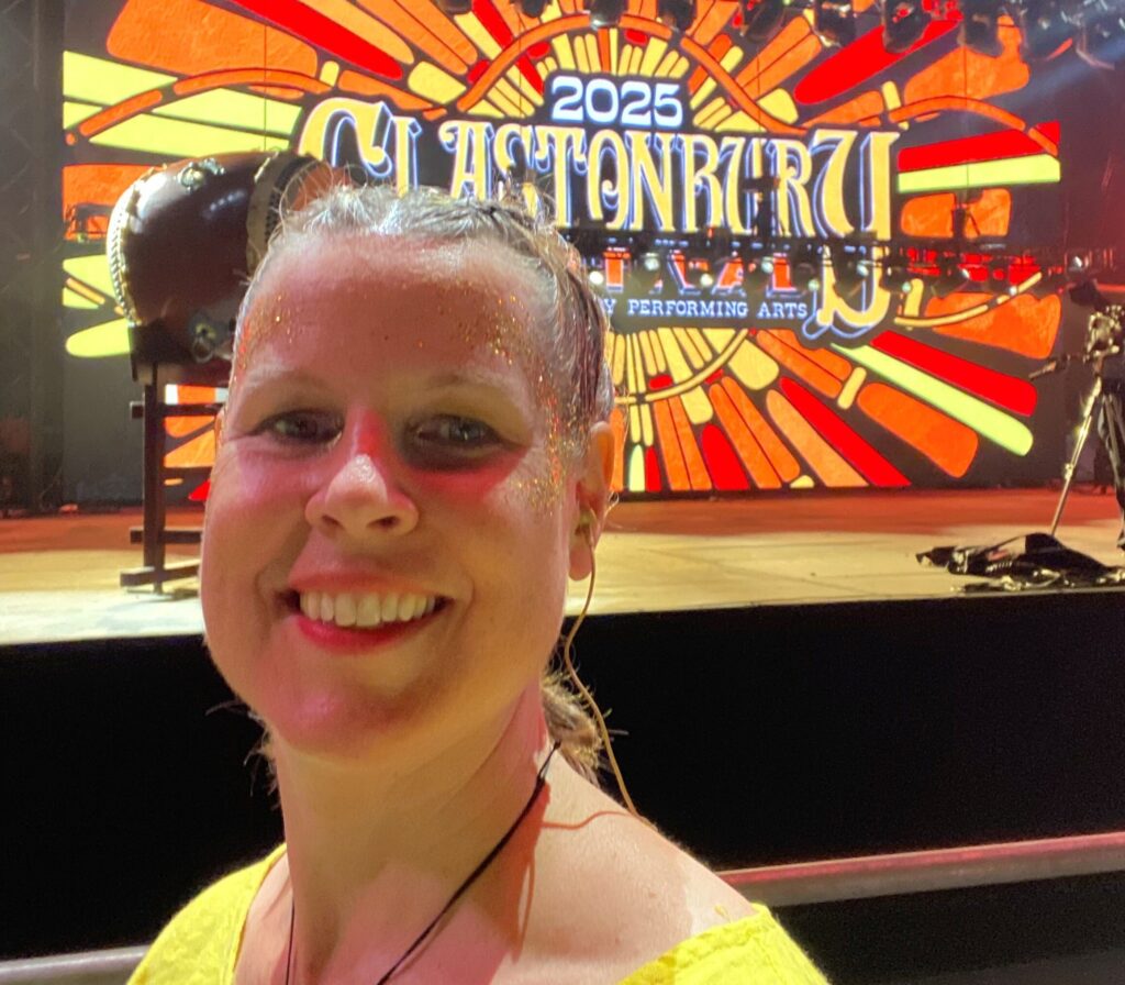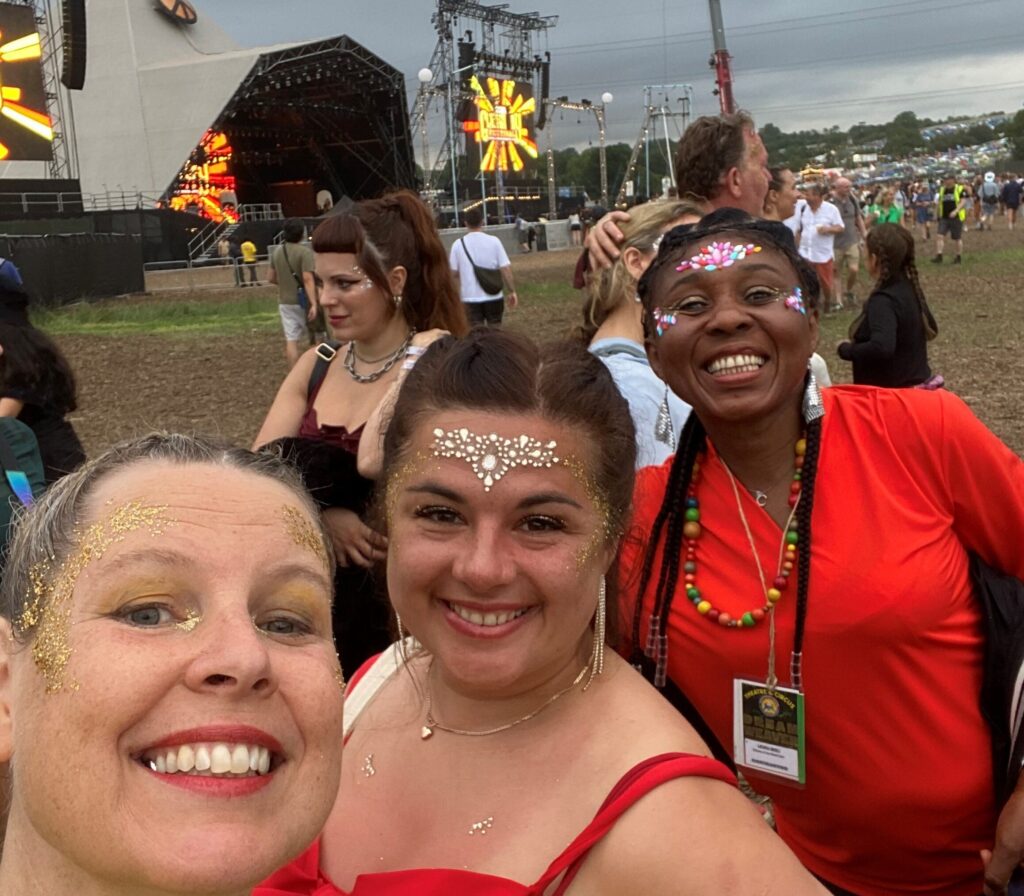 At the Messy Church conference we’d unpacked 1 Corinthians 12:12-31, thinking about the body of Christ, and how everyone has a valuable part to play. Over the course of our Glastonbury stay, I watched the camaraderie build between choir members, sharing their stories, helping each other out, making sure those with accessibility needs were catered for, everyone looking out for each other. It was the best non-church church I’ve been a part of, littered with spiritual conversations. My favourite part of the experience was the afternoon spent preparing for our big night. With a successful rehearsal that morning, our confidence was bolstered and we spent the afternoon back at the campsite changing into our bright coloured costumes, plaiting hair and helping with make-up (as it was due to be filmed for the BBC Glastonbury channel), ahead of making our way to the production tent behind the Pyramid stage, for a glow-up and glitter by the professional make-up artists.