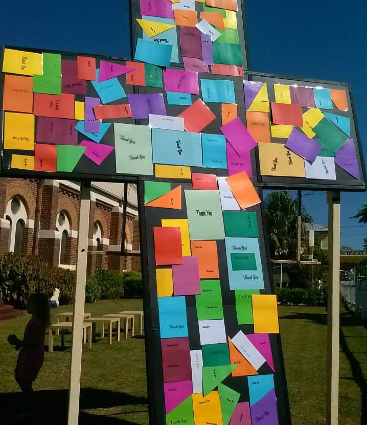 Could not resist sending you the attached photos! What an amazing Messy Easter we had at St Matthew’s. Decided to have a Messy Good Friday as an extra with 65 in attendance and then our normal 3rd Sunday Messy Church fell on Easter Day and 140 men, women and children packed the church. We had catered for around 100 so we ran out of space and food and crafts! But no complaints and everyone really enjoyed Messy Easter. Two young women, once church goers but who had left the church, were heard to say that ‘Easter had come alive again for them through coming to Messy Easter’. The tears hanging in the church were started at our Messy Church in early Lent and continued to be made for the rest of Lent. Each strand has a prayer and the colours represented different prayer themes each Sunday. Our large cross outside the church was used again for our prayer activity – on Good Friday with red torn paper crosses with prayers – and on Easter Sunday with brightly coloured ‘Thank You’.