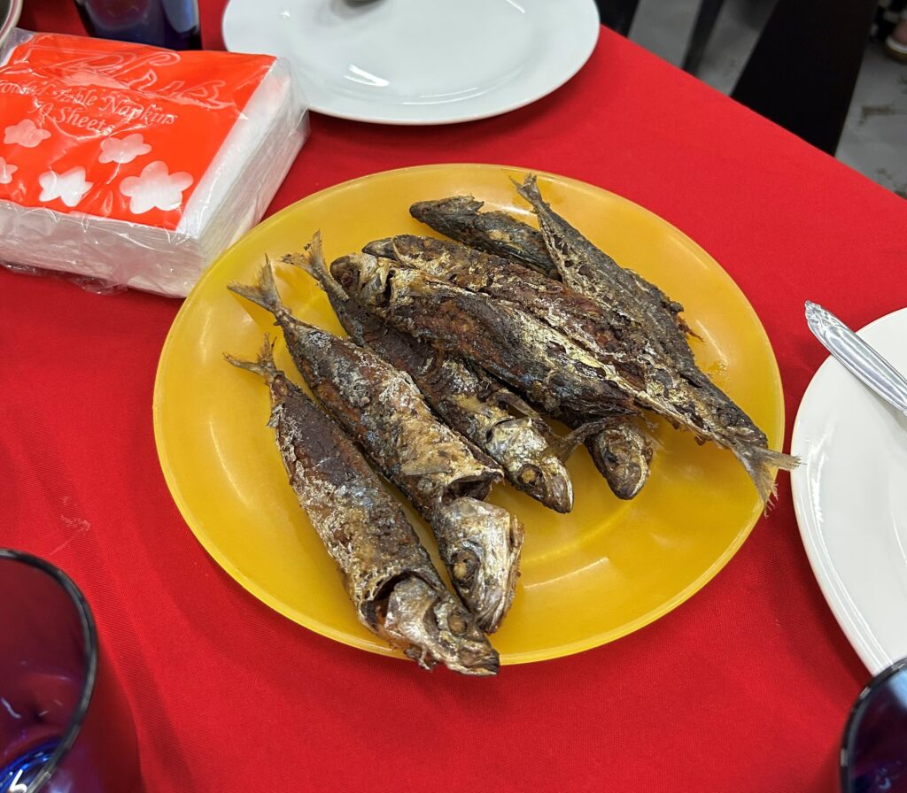 We had lunch in the church every day, cooked by church members. Rice every time with different additions including fish with their heads on! One evening we found the local Burger King because we were desperate for chips (French fries)!
