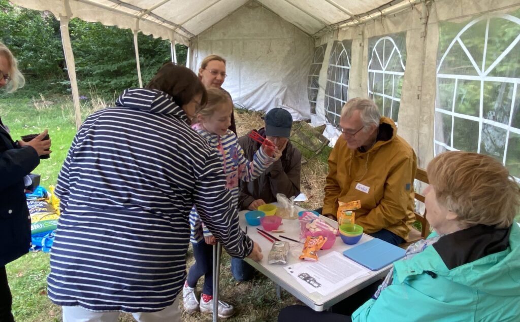 We started with some time together inside learning a little bit about the why of Messy Church Goes Wild and the resources that are available to help Messy Churches get outside. If you’d like to explore this take a look here or watch this introductory video. But the best way to learn is to have a try so we soon got outside together! Aike took us ‘On the Move’ a chance to walk and stop at different points sharing as we went. Even in late September it was amazing how many different things people found using magnifying glasses!