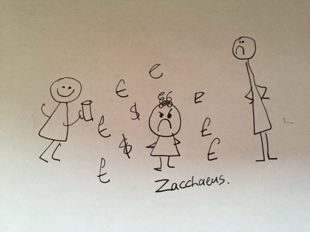 - Watch the story of Zacchaeus, retold here. Then read the story of Zacchaeus from Luke 19:1-10 and ask everyone to stop you during the story any time they notice someone being cut off from fellowship and any time they notice someone being brought into fellowship.
