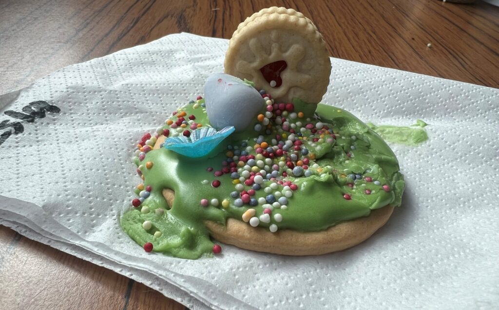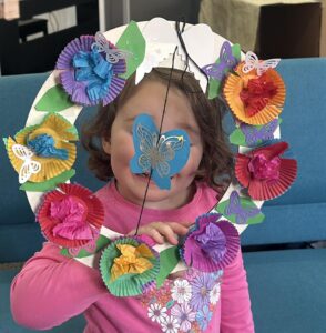 We made beautiful celebrate new life through the risen Lord – Easter wreaths. It was a special extra Messy Church – mid week- during the Easter school Holidays just after Easter Sunday. Lots of discussions around the craft table – about symbols of new life and how Jesus gives us a new life. The butterfly in the middle actually spins with a little blow.