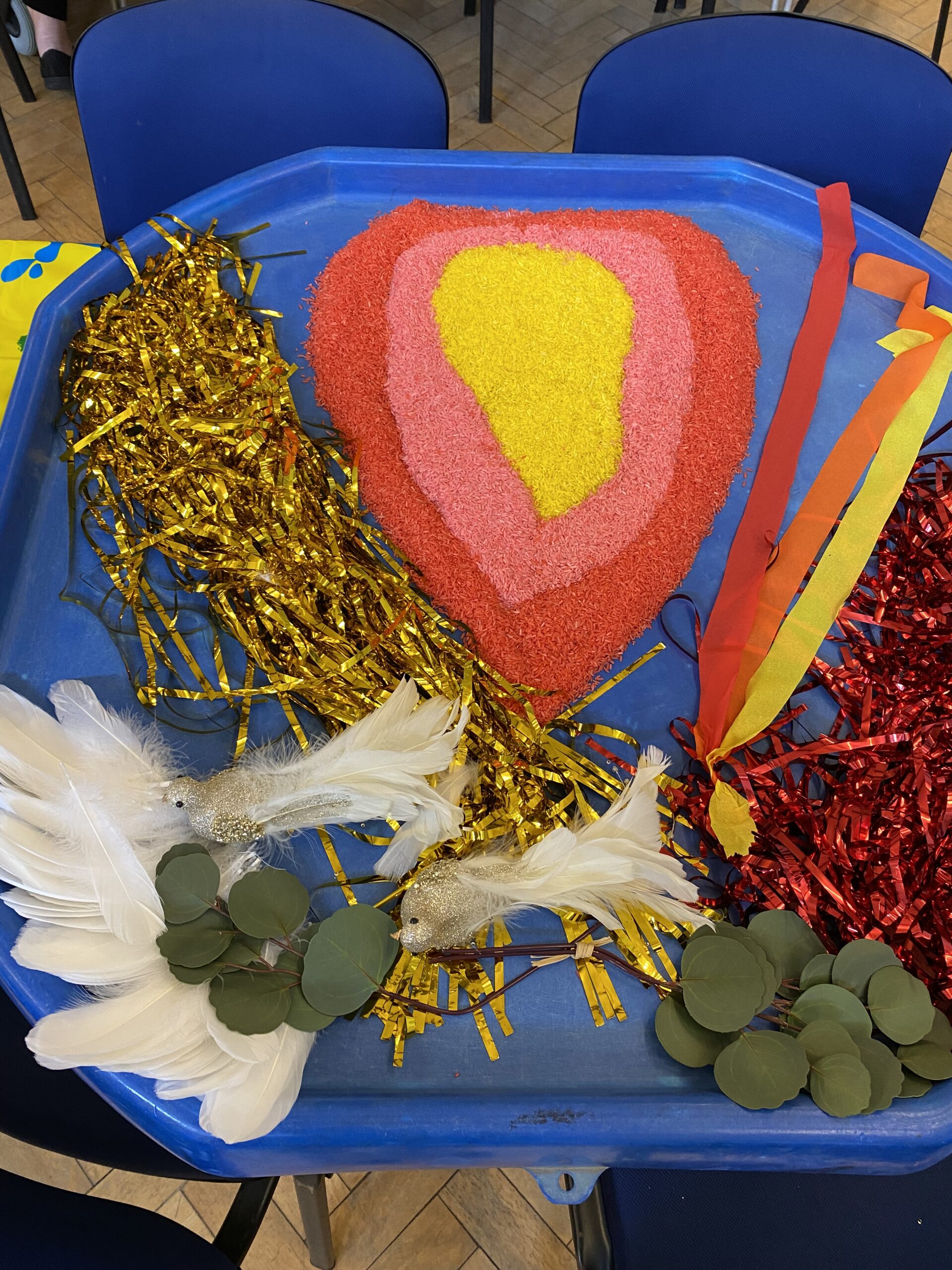 ‘We normally have a hexagon-shaped tray and we put different objects for sensory play on it. We try to make them pertinent to the story. So, for example, when we did Pentecost, we had different coloured rice on the tray: red rice, orange rice and white rice and little doves with real feathers. We also had strips of different coloured crepe paper, and in one of the activities we got them to tie the strips onto garden canes so they could wave them to look like flames. Everything was relevant to the Pentecost theme and were things families could do together. That’s how it’s meant to be, isn’t it? So at one level, it’s exactly like any other Messy Church: it just works!’